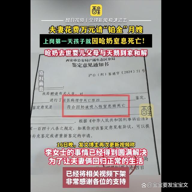 后续来了!婴儿被月嫂呛死,夫妻与天鹅到家和解,处理结果惹讽刺